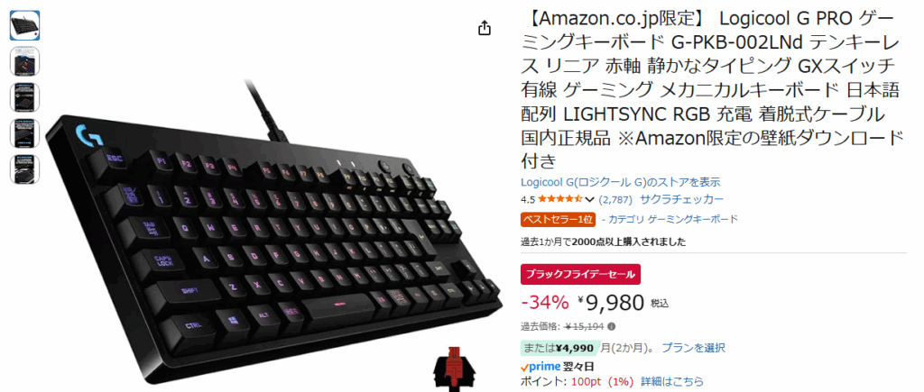 まじでオススメです。テンキーレスなので場所を取らない。性能も良いし、ゲーミングライトも専用アプリから設定できる。いやなところがひとつもない。ゲーマーじゃなくてもキーボードはみんなこれでいいんじゃないかなって思うレベル。しかも割引率34%と破格なのでほんとうにオススメ。