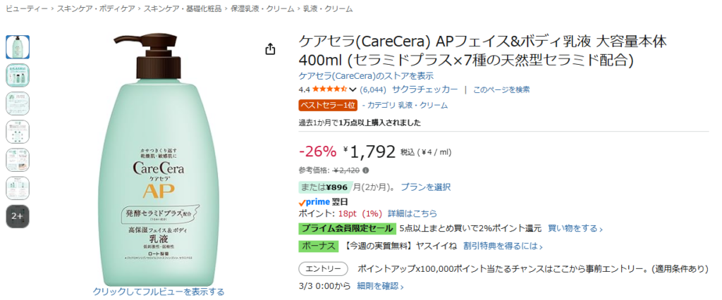 ケアセラ(CareCera) APフェイス&ボディ乳液 大容量本体 400ml (セラミドプラス×7種の天然型セラミド配合)