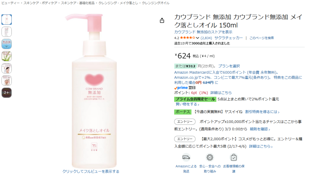 とても安くてたすかる。クレンジングオイル自体初めて買ったから評価とかできない。